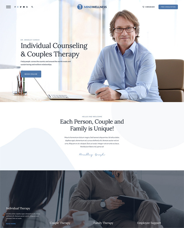 We prepared 4 Home Pages: Private Psychiatry Clinic, Psychologist, Psychotherapy and Counselling. Unlimited color skins and numerous inner pages such as Portfolios and Single Portfolio pages, 4 Galleries, Shop pages, Contact pages, About Us , Team, Blog Pages, 404 and Coming Soon pages and many Elements…
